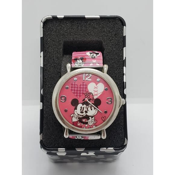Disney Minnie and Mickey heart watch. Large pink face with silver hands and number indicators. Minnie and Mickey on watch face holding each other. Pink plaid heart and white and pink stitched heart on face. Stainless steel back, Not water resistant. Working watch